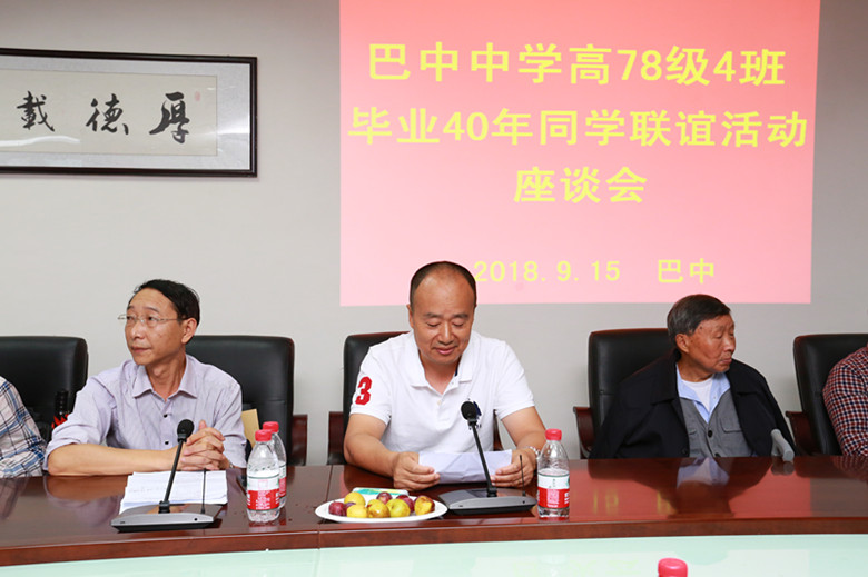 巴中中學(xué)黨委書記、校長劉兆嘉同志致辭,對高78級4班校友40年后重回母校表示熱烈的歡迎,對巴中中學(xué)近年來取得的成績以及發(fā)展現(xiàn)狀做了全方位的闡述,向校友們介紹了巴中中學(xué)150周年校慶的籌備情況,并熱情邀請各位校友屆時重回母校共慶華誕!