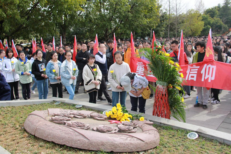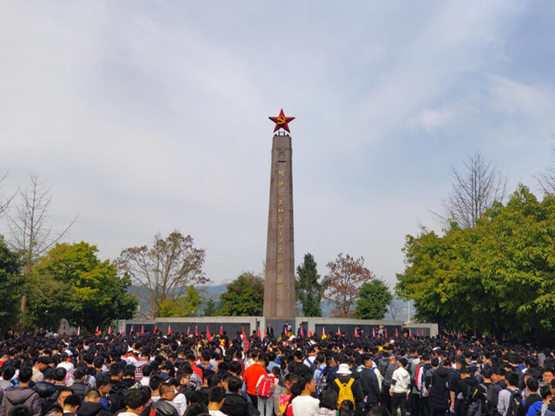 延綿的山路在旖旎的自然風(fēng)光中褪去了艱辛的底色,遙遠(yuǎn)的終點(diǎn)在鏗鏘堅(jiān)定的步伐中消融了苦澀的滋味。一路歡歌,一路追逐,讓數(shù)小時的跋涉沖淡了疲憊、遺忘了坎坷,大家相聚于南龕山將帥碑林,在主持人的組織下,35列縱隊(duì)順著35面旗幟排成矩陣,所有人翹首而望,臉色凝重,不約而同地用目光凝視著“紅軍將士英名紀(jì)念碑”,每一雙眼睛都飽含著緬懷先烈的無限深情,王校長熱情洋溢的演講讓大家沉醉,幾千人莊重的誓言讓群山沸騰,敬獻(xiàn)給烈士的雛菊在和煦的陽光下寂靜無聲,緊接著瞻仰30余萬血沃中華的英靈,聆聽他們的動人事跡,每一個人都步履沉重,每一個人都眉尖若蹙!叭ジ惺軞v史的厚重,去領(lǐng)略先烈的情懷,去重塑個人的信仰,去暢想自己的人生”,王校長擲地有聲的演講似暮鼓晨鐘,撥動著每一位集會者的心弦,洗滌著每一位參觀者的靈魂。