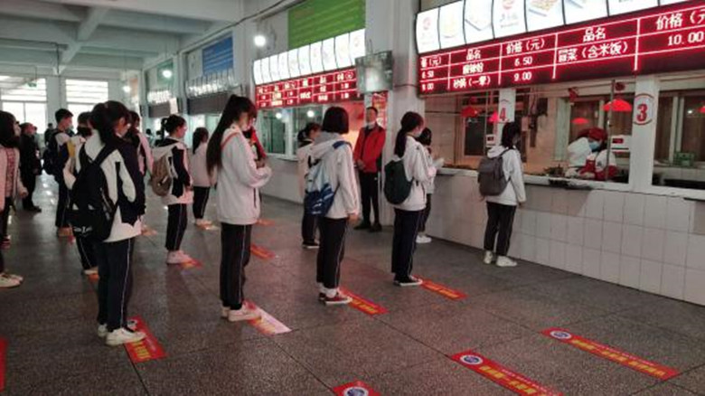 食堂里,廚師們早已為同學們準備好了噴香可口的飯菜,等待他們的享用。11:40,各班級分層分時錯峰放學,在班主任的帶領下,在學校干部、值班人員現(xiàn)場維持下,學生排隊依次進入食堂洗手、取餐,單向坐到貼有班級姓名的餐桌用餐。他們品嘗的是美味,品嘗的是教職工對其關心的香甜。