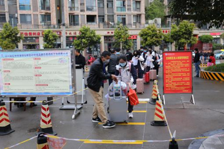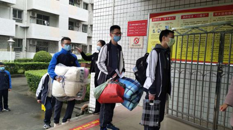 4月1日上午,雖無朗日高照,但天空承載著疫情防控的滄桑,承載著如詩的心語,承載著對夢想的期盼,龍湖校區(qū)高三開學工作在社會各界的關注下拉開了序幕。1724名學生按規(guī)定時間錯峰上學。清晨7點30分,滿懷憧憬的第一批學生在家長陪同下來到校門口等候。但這一次和以往開學不同,在學校領導和各班主任的統(tǒng)一指揮下,學生按間隔1米的距離依次排隊進入專門通道,2名老師依次驗證學生身份、問詢并檢查健康卡,體溫檢測合格后進入校園。隨后醫(yī)務工作者對運送到校內的行李逐一消毒。