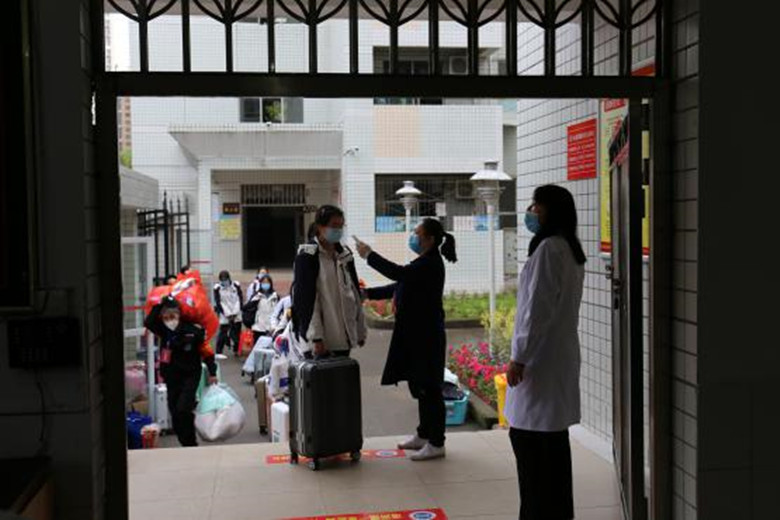 河邊,綠柳在微風輕拂下婀娜起舞;林蔭路旁,鳥兒在樹上展露清脆的歌喉;教學樓前,櫻花散發(fā)出陣陣清香,龍湖的一枝一葉,一草一木都在歡迎闊別已久的學子。8:00左右,學生在宿舍外依次排隊,再次經(jīng)過宿舍管理老師檢測體溫并逐一登記后進入寢室整理內務。經(jīng)歷了這個超長寒假,學生終于再次回到溫馨而熟悉的校園,內心難免充滿著激動和欣喜,見到久別重逢的同學,縱有千情訴說,卻嚴格遵守著學校規(guī)定,保持距離,用微笑點頭替代促膝交談,用揮手致意表達關心問候。整理完寢室內務后,同學們便匆匆前往教室。