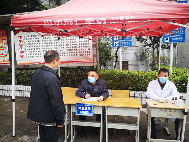 “學(xué)生”戴好口罩在教室外排隊——班主任檢查《健康記錄卡》——班主任對“學(xué)生”逐一進行體溫檢測并登記——“學(xué)生”進入教室上課。