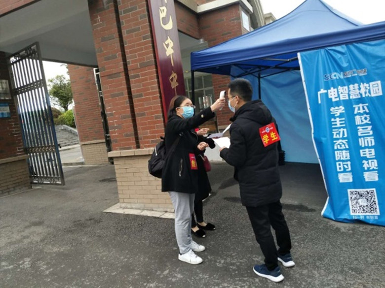 場景一 “學生”有序排隊、通過體溫檢測合格后入校