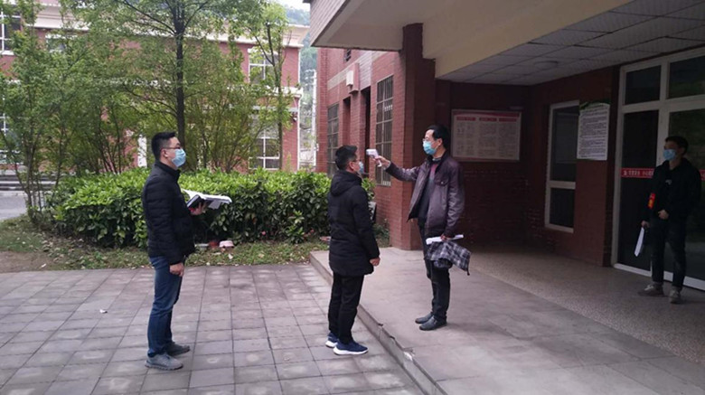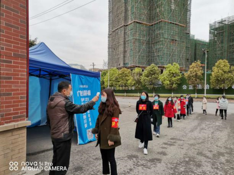 校門口外,“學生”們以1米的間距有秩序地排隊。兩位老師值守在校門口體溫檢測點,其中一位老師負責通過熱成像體溫儀觀測每一位入校“學生”體溫,另一位老師負責記錄每一位“學生”的體溫。班主任與黨員老師維持現(xiàn)場秩序。
