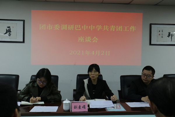 4月2日上午,團(tuán)市委副書(shū)記劉素娟一行三人蒞臨我校調(diào)研新學(xué)期共青團(tuán)工作。巴中中學(xué)專(zhuān)職副書(shū)記、校團(tuán)委分管領(lǐng)導(dǎo)馬松濤出席會(huì)議,校團(tuán)委委員、少先隊(duì)大隊(duì)輔導(dǎo)員等參加了會(huì)議。