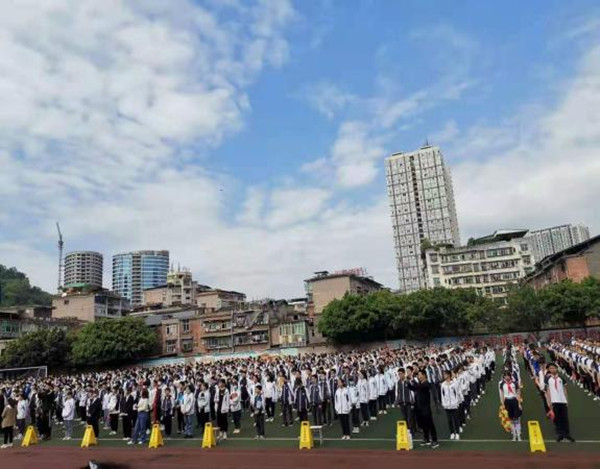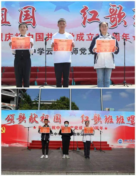 在王玉芳老師的指揮下,師生齊唱國(guó)歌,五星紅旗冉冉升起。巴中中學(xué)云屏校區(qū)執(zhí)行校長(zhǎng)李發(fā)坤宣布巴中中學(xué)云屏教師黨支部慶祝中國(guó)共產(chǎn)黨成立100周年“頌歌獻(xiàn)祖國(guó) 紅歌班班唱”活動(dòng)正式開(kāi)始,云屏校區(qū)教師黨支部書(shū)記王學(xué)成為本次紅歌活動(dòng)開(kāi)幕致辭,校區(qū)德育主任劉開(kāi)明宣讀了本次活動(dòng)規(guī)則。