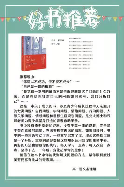 孫躍老師今天穿著職業(yè)女裝,顯得精神干練,登場后,先亮出她的招牌笑容,融化全場,然后不急不徐地以清脆悅耳又富有激情的開場白一下子抓住全場。她說“人可以不成功,但必須學(xué)會自己長大。而好的書籍就如良師益友為我們的成長撥云見日,讓我們在成長的困境中越走越通暢……希望在我們的交流活動中同學(xué)們積極分享自己的閱讀體驗(yàn),更希望同學(xué)們在思想的交流中碰撞出新的火花。”