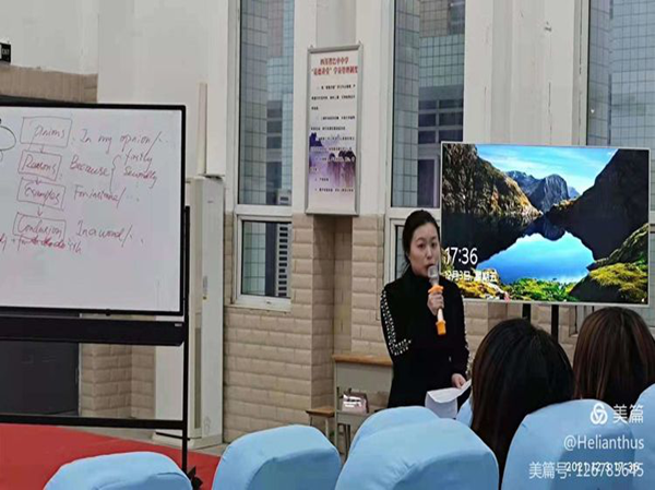 教研活動在高中年級英語教研組長戚思蘭老師宣布開始中拉開了序幕,初中青年教師楊麗帶來第一節(jié)寫作課,她以“Should We Do Chores?” 引入話題,引起學(xué)生的興趣和思考,隨后學(xué)生談?wù)撟约簩覄?wù)的觀點(diǎn)和看法。根據(jù)學(xué)生的觀點(diǎn)分成兩組陣營,學(xué)生通過閱讀文本信息提取觀點(diǎn),找出文本信息中做家務(wù)的原因和好處,最后總結(jié)文本中的觀點(diǎn)態(tài)度。楊麗老師以漢堡的結(jié)構(gòu)搭建學(xué)生的認(rèn)知結(jié)構(gòu),結(jié)合學(xué)生生活已知知識搭建和新知識體系的聯(lián)接,形成情感共鳴,培養(yǎng)了學(xué)生的語言能力,學(xué)習(xí)能力和思維品質(zhì),提升了學(xué)生的核心素養(yǎng)。