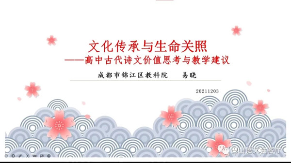 下午2點(diǎn)20分,參會(huì)教師到會(huì)簽到,2點(diǎn)30分至3點(diǎn)50分,與會(huì)教師參加了四川省教育科學(xué)院網(wǎng)絡(luò)教研活動(dòng),聽取了成都市錦江區(qū)教科所語文教研員易曉老師的學(xué)術(shù)講座《文化傳承與生命關(guān)照——高中古代詩文價(jià)值思考與教學(xué)建議》。