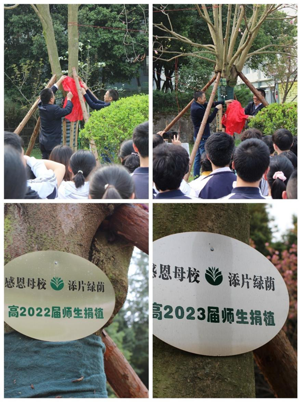 高中一部主任張磊、高中三部主任黃軍祥為新植的兩株玉蘭樹揭牌。