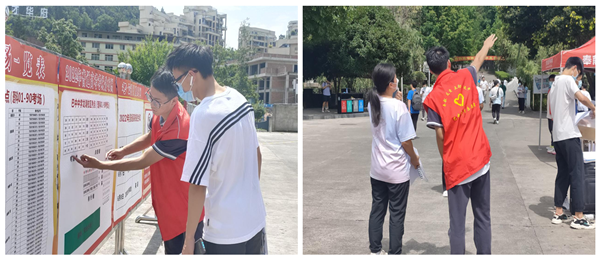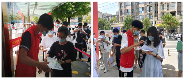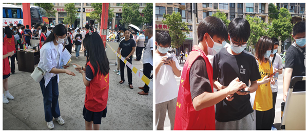 6日下午13:00,參加活動(dòng)的帶隊(duì)老師和志愿者們到達(dá)志愿服務(wù)點(diǎn);顒(dòng)現(xiàn)場(chǎng),學(xué)弟學(xué)妹們身著全套校服與紅色志愿者服,在帶隊(duì)老師的組織、安排下,在校門口為考生們進(jìn)行消毒并協(xié)助學(xué)校工作人員查看核酸報(bào)告、健康碼及行程碼,在校內(nèi)則積極地為考生們進(jìn)行道路指引與帶領(lǐng)服務(wù)。