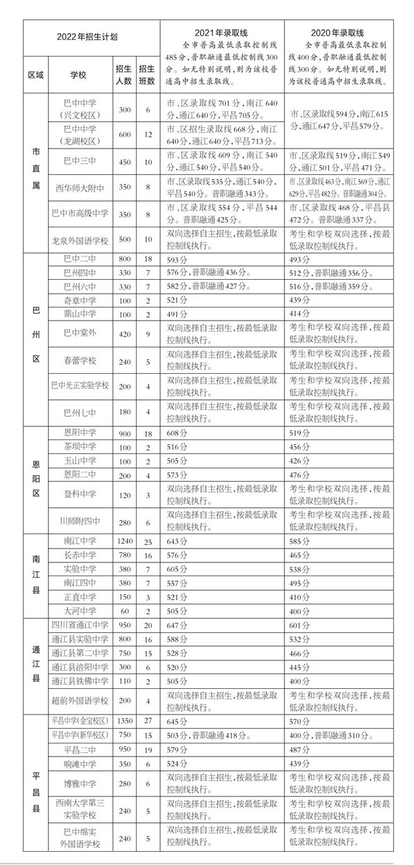 根據(jù)我市招考和教育主管部門公開發(fā)布的資料,整理出我市2022年普通高中學校的招生計劃以及這些學校在近兩年的招生錄取線,供學生直觀了解。由于每年試題難易程度、考生個體差異、普職比變化等因素,每年的最低錄取控制線有較大幅度變化,不能完全體現(xiàn)該校的辦學特色、更不能反映近一年學校的辦學效果,僅供考生和家長了解各校點布局,并綜合學校錄取線與全市控制線分差、個人大致位次等因素,才能在填報高中志愿中有所參考。提醒所有中考考生,填報志愿一定要熟悉巴中2022年高中招生實施辦法和網(wǎng)上志愿填報辦法后,才能科學填報好志愿?忌部梢韵虍?shù)卣锌疾块T、目標學校進行咨詢。