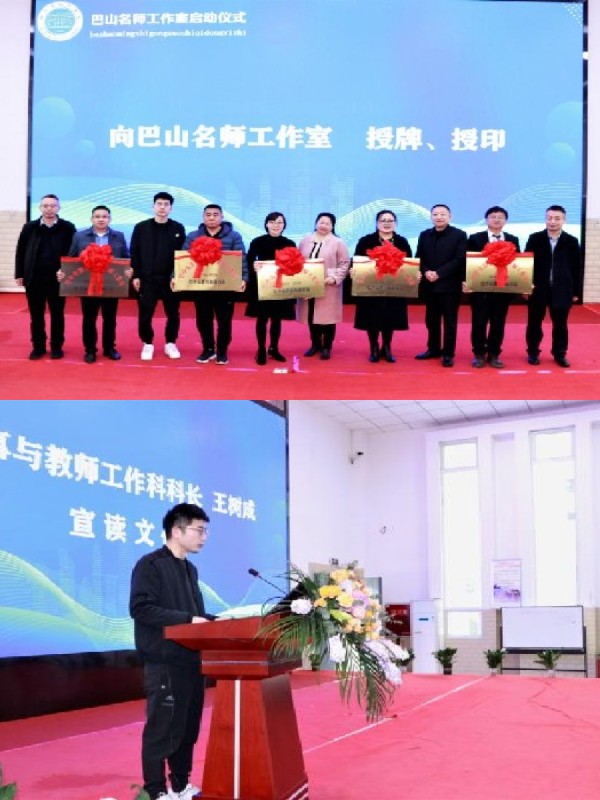 市教育和體育局人事與教師工作科科長王樹成宣讀《巴中市第二批巴山名師工作室領(lǐng)銜人名單》《巴中市第二批巴山名師工作室成員名單》。任智慧、彭中華、熊維壯等為五個學(xué)科名師工作室授牌、授印。