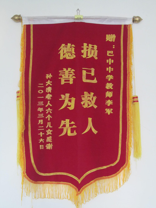 3月26日上午,得救老人孫大清攜同子女經(jīng)多方打聽來到巴中中學(xué),當(dāng)面向李均老師致謝,并送來一面“損己救人,德善為先”的錦旗。