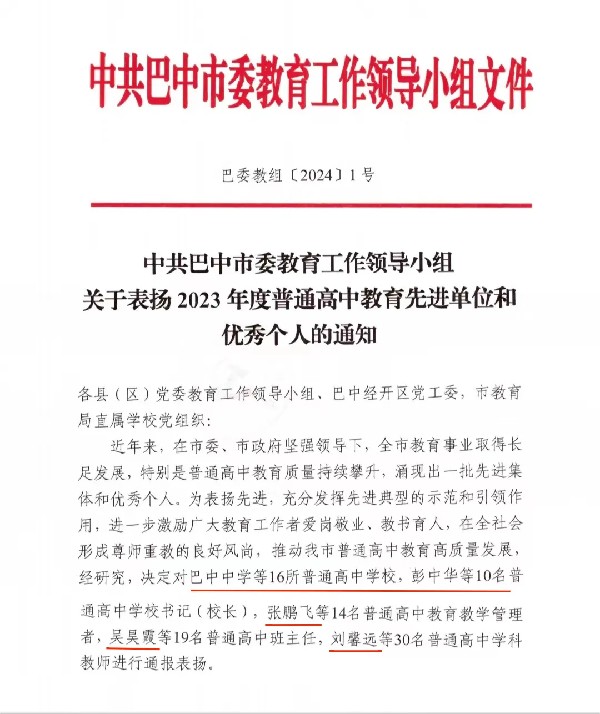 吳昊霞榮獲“巴中市2023年度普通高中教育優(yōu)秀班主任”稱號。
