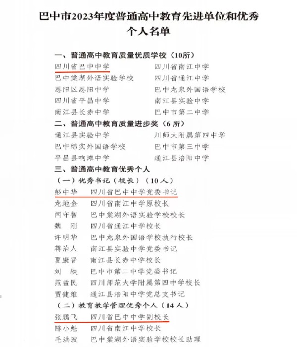 黨委書記彭中華榮獲“巴中市2023年度普通高中教育優(yōu)秀書記(校長)”稱號。