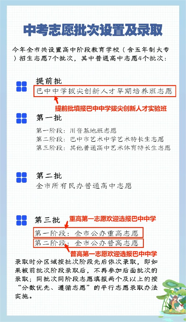 ◆全市有意愿來我校就讀的初三優(yōu)秀畢業(yè)生均可填報,在提前批次中自主填報“巴中中學(xué)拔尖創(chuàng)新人才早期培養(yǎng)班志愿”,完全不影響其它批次任何志愿填報。