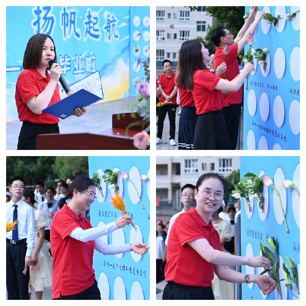 云屏校區(qū)初三教師代表李艾琴懷著滿心激動與感動,回顧三年如歌歲月,在臨別之際,以花之名,帶領初三全體教師為同學們送上祝愿。老師們親手將一朵朵鮮艷的玫瑰、一只只潔白的梔子、一束束飽滿的麥穗.......掛上花墻,惟愿孩子們讀萬卷書,行萬里路,于萬里長空,破萬千風浪!