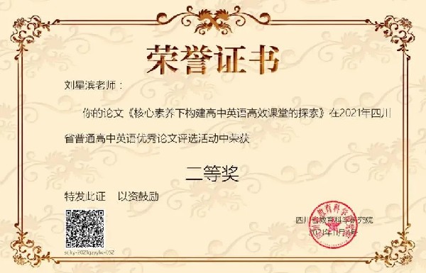 新形勢(shì)帶來(lái)許多新問(wèn)題,問(wèn)題即課題。劉老師在工作中喜歡發(fā)現(xiàn)問(wèn)題、研究問(wèn)題,并努力解決問(wèn)題。近年來(lái),劉老師變問(wèn)題為課題,變問(wèn)題解決為科研論文和教育案例的來(lái)源,主持市、省課題5項(xiàng),發(fā)表論文10篇,參與并獲得高中英語(yǔ)優(yōu)課和作業(yè)設(shè)計(jì)市級(jí)獎(jiǎng)各1次,獲得教育成果市級(jí)獎(jiǎng)1次、社科成果市政府獎(jiǎng)1次,梳理德育案例、家庭教育案例、班主任優(yōu)秀成果、教育科研成果多次獲省級(jí)獎(jiǎng)。