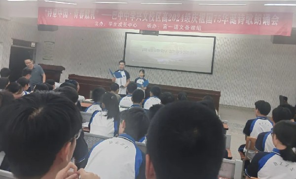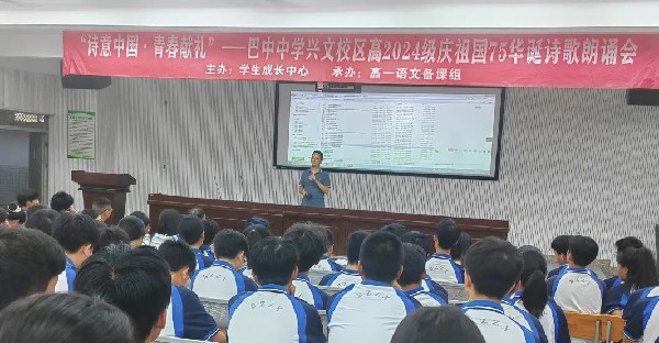 為慶祝新中國成立75周年華誕,向祖國母親獻上最誠摯的祝福,9月24日,巴中中學(xué)興文校區(qū)高一年級在多功能報告廳隆重舉辦了一場別開生面的“詩意中國,青春獻禮”詩歌朗誦比賽。