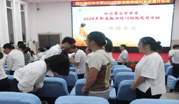為貫徹全國教育大會精神和巴中市教育工作會議精神,推動四川省巴中中學“青藍工程”落地生根,持續(xù)優(yōu)化師資隊伍,提高教育教學水平。2024 年9月25日巴中中學在龍湖校區(qū)舉行以“青藍結(jié)對傳‘新’火,攜手共進‘慧’成長”為主題的新老教師結(jié)對儀式。巴中中學副校長張鵬飛主持本次活動。