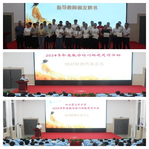 巴中中學黨委書記彭中華、校長熊維壯為指導教師頒發(fā)聘書,結(jié)對師父代表崔銘文、結(jié)對徒弟代表陳驕陽上臺發(fā)言。