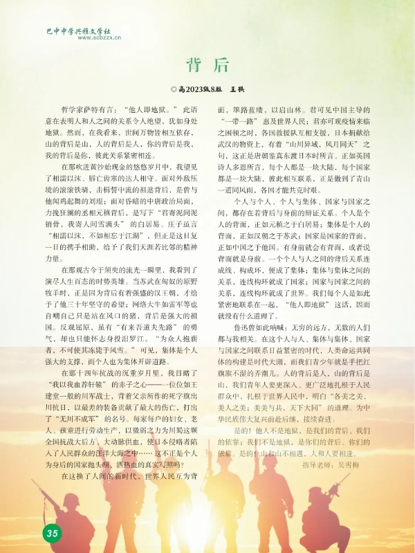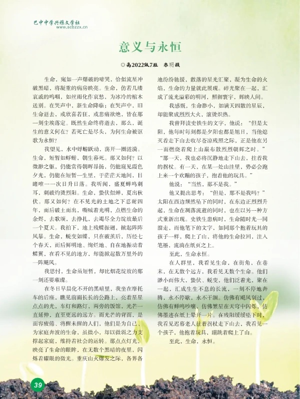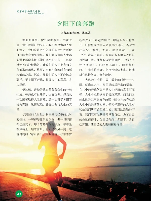 個(gè)人寄語:巴山疊翠,巴水奔涌,晨光刻理想,星輝淬鋒芒。筆鋒丈量云梯,跌撞蓄養(yǎng)春光,學(xué)子韌勁化登天脊骨,興文問道處,朝霞漫天翔。