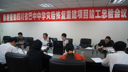 2013年4月16日,巴中市教育局組織召開香港特區(qū)政府援助巴中中學(xué)災(zāi)后重建項目竣工總驗會議,巴中市發(fā)改委、巴中市教育局、巴州區(qū)發(fā)改局、巴州區(qū)教育局、巴州區(qū)質(zhì)安站和項目建設(shè)單位、施工單位、監(jiān)理單位等相關(guān)人員參加了會議,會議邀請了省教育廳陳敬東先生到會指導(dǎo)驗收工作,并特邀香港特區(qū)教育局觀察員尹一鳴、麥浩旻先生參與項目竣工驗收。項目竣工總驗會議由巴中市教育局副局長杜標(biāo)同志主持。