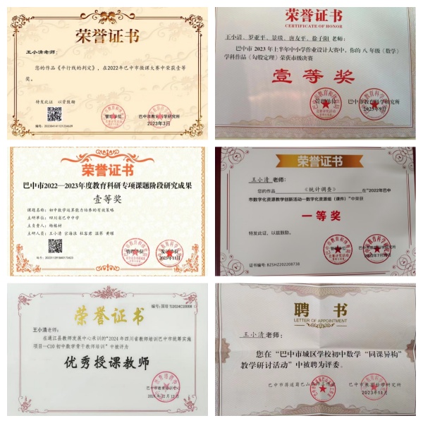 個人簡介:王小清,女,一級教師,初中數(shù)學教師。巴中中學數(shù)學教研組長,巴中中學云屏校區(qū)拔尖創(chuàng)新人才培養(yǎng)中心主任。曾獲四川省作業(yè)設計一等獎,四川省內外兼修優(yōu)秀論文二等獎,市直屬優(yōu)秀班主任、優(yōu)秀教育科研工作者。