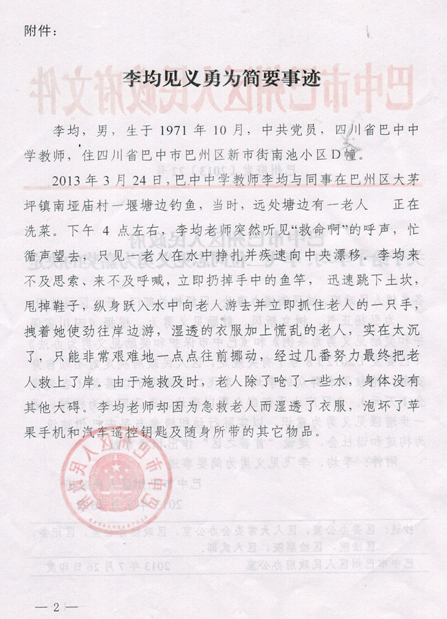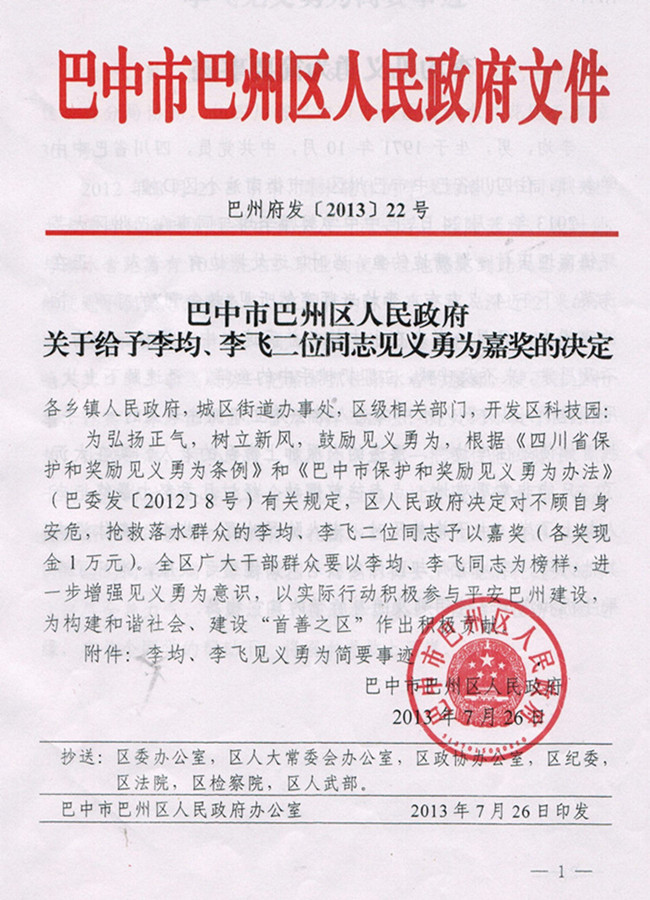 巴中市巴州區(qū)人民政府關(guān)于給予李均同志見義勇為嘉獎的決定