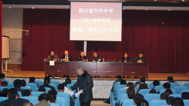 為進(jìn)一步推進(jìn)學(xué)校思想道德建設(shè)和安全穩(wěn)定工作,探索新時(shí)期班主任工作的新方法、新途徑,進(jìn)一步加強(qiáng)班主任工作,充分發(fā)揮班主任在教育學(xué)生中的重要作用,2014年2月19日,四川省巴中中學(xué)新學(xué)期德育、安全工作會(huì)議在云屏校區(qū)多功能報(bào)告廳召開。會(huì)議由學(xué)校黨委副書記馬松濤主持,學(xué)校全體干部、全校班主任及相關(guān)管理人員參加會(huì)議。