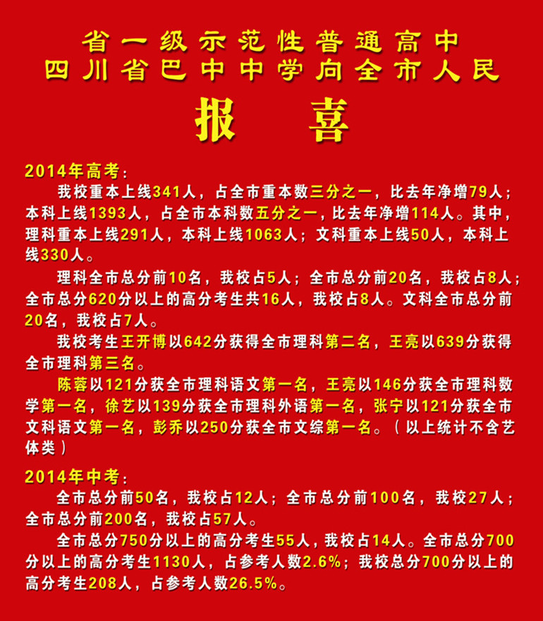 巴中中學(xué)2014年高考、中考喜報(bào)