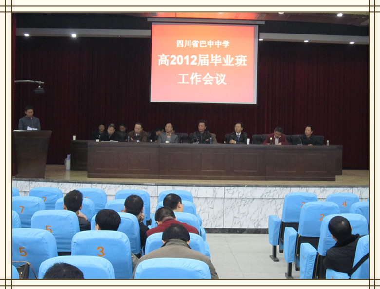 學(xué)校黨委書記、校長王必義在會上高度評價了高2012屆教師團隊是一支優(yōu)良的團隊,多年來為巴中中學(xué)的輝煌業(yè)績立下了汗馬功勞,是巴中中學(xué)寶貴的精神財富和備戰(zhàn)高考的強大精神動力。同時也指出,高2012屆是實施新課改以來最后一屆舊高考年級,也是市直屬以后第一屆高中出口年級,本屆高三的質(zhì)量,事關(guān)2200多名學(xué)生的成長前景,事關(guān)80多名高三老師和全校400多名教職員工的榮譽和切身利益,事關(guān)巴中中學(xué)的現(xiàn)實地位和發(fā)展前途,因此,我們沒有選擇、沒有退路,只有以精細(xì)的管理、做最后的沖刺拼搏,來保障我們做一個“不服輸也不能輸?shù)陌椭兄袑W(xué)人”!