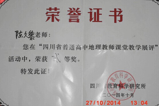 四川省2014高中地理優(yōu)質(zhì)展評課于2014年10月在美麗的涼山彝族自治州西昌市舉行,我校青年地理教師陳久黎代表巴中市參加比賽,獲得二等獎。