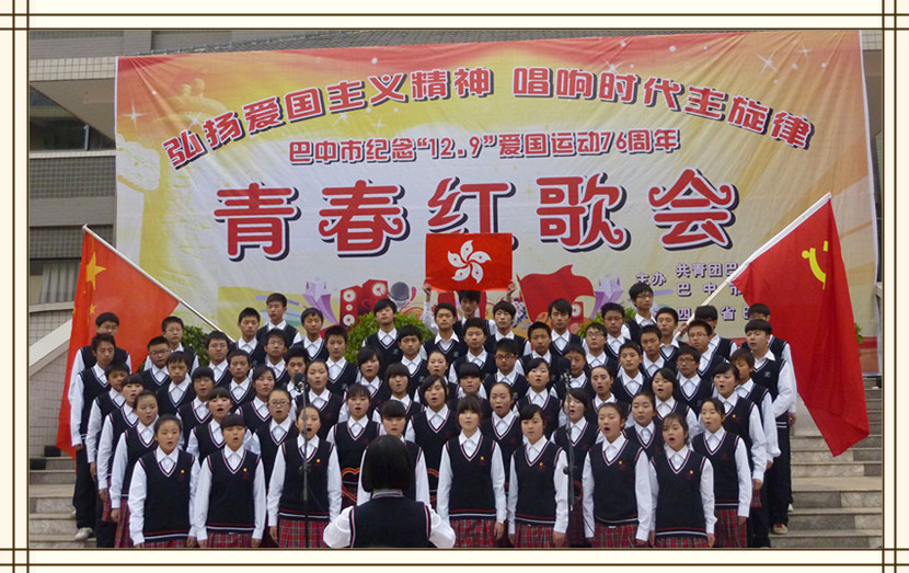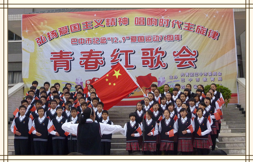 為隆重紀念“12·9”愛國青年的革命運動,由共青團巴中市委員會、巴中市教育局主辦,四川省巴中中學承辦的“紀念“一二·九”愛國運動76周年青春紅歌會”,于2010年12月9日下午在巴中中學本部辦公樓前舉行。市委常委、組織部長、市總工會主席譚紅杰,副市長袁聞聰,市教育局黨委副書記、紀委書記姚仕君,市教育局黨委副書記、教育工會主席劉君凱出席了此次活動;顒佑晒睬鄨F巴中市委書記李全慶主持。