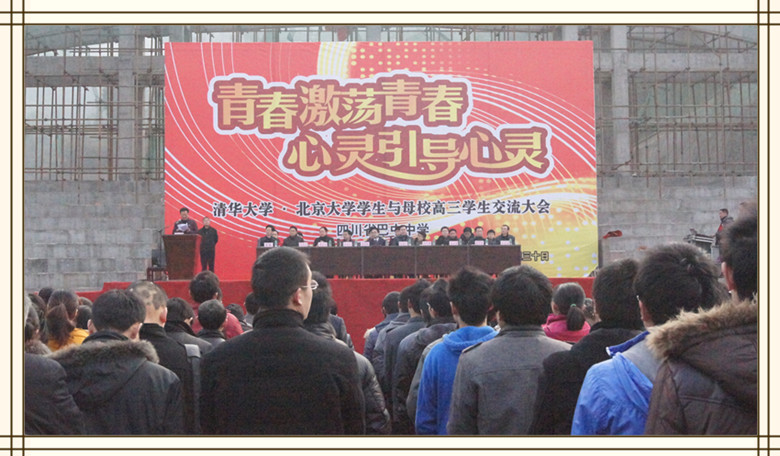 2012年1月30日上午9點(diǎn),在四川省巴中中學(xué)龍湖校區(qū)田徑運(yùn)動(dòng)場(chǎng)舉行了一場(chǎng)“青春激蕩青春,心靈引導(dǎo)心靈——清華、北大學(xué)子與母校高三學(xué)生交流大會(huì)”。交流大會(huì)由學(xué)校黨委委員、副校長(zhǎng)劉兆嘉主持,參會(huì)的有巴中市副市長(zhǎng)袁聞聰、巴中市教育局黨委書記局長(zhǎng)趙建仁、學(xué)校黨委書記校長(zhǎng)王必義、黨委委員副校長(zhǎng)劉兆嘉、副校長(zhǎng)趙仕安、校友現(xiàn)就讀于北京大學(xué)的岳 嵩、就讀于清華大學(xué)的顧釗全、羅智德、王威揚(yáng)、李 權(quán)、董 偉、金 成、張 桂、何 珅以及高三全體師生和部分高中學(xué)生家長(zhǎng)代表共3000余人。