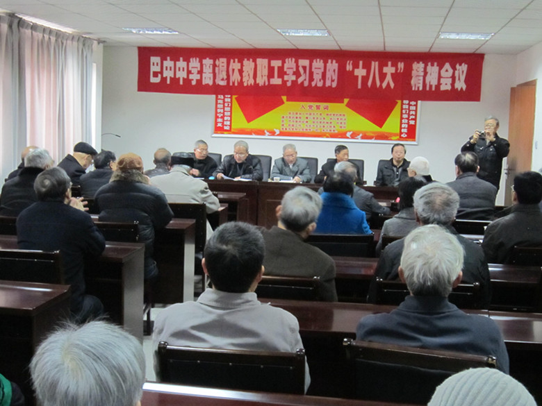 2012年11月28日上午9時(shí),巴中中學(xué)云屏校區(qū)四樓會(huì)議室,歡歌笑語,喜氣洋洋。巴中中學(xué)離退休教職工協(xié)會(huì)、離退休黨支部組織了全體離退休教職工歡聚一堂,認(rèn)真學(xué)習(xí)貫徹黨的十八大精神。