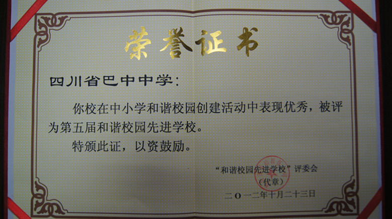經(jīng)過長期不懈的努力,巴中中學(xué)在2012年國家教育部基礎(chǔ)教育司組織的“全國第五屆和諧校園先進(jìn)學(xué)!痹u選中獲評“和諧校園先進(jìn)學(xué)!笔鈽s。
