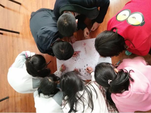 活動采取繪畫、涂鴉、集體作畫的形式,學生在認識色彩的心理學意義的同時能夠通過不同的方式來認識自我、展現(xiàn)自我,引導學生形成良好的、更全面的自我概念。同學們積極參與,開心作畫,在歡笑與趣味中了解知識,成長自我。